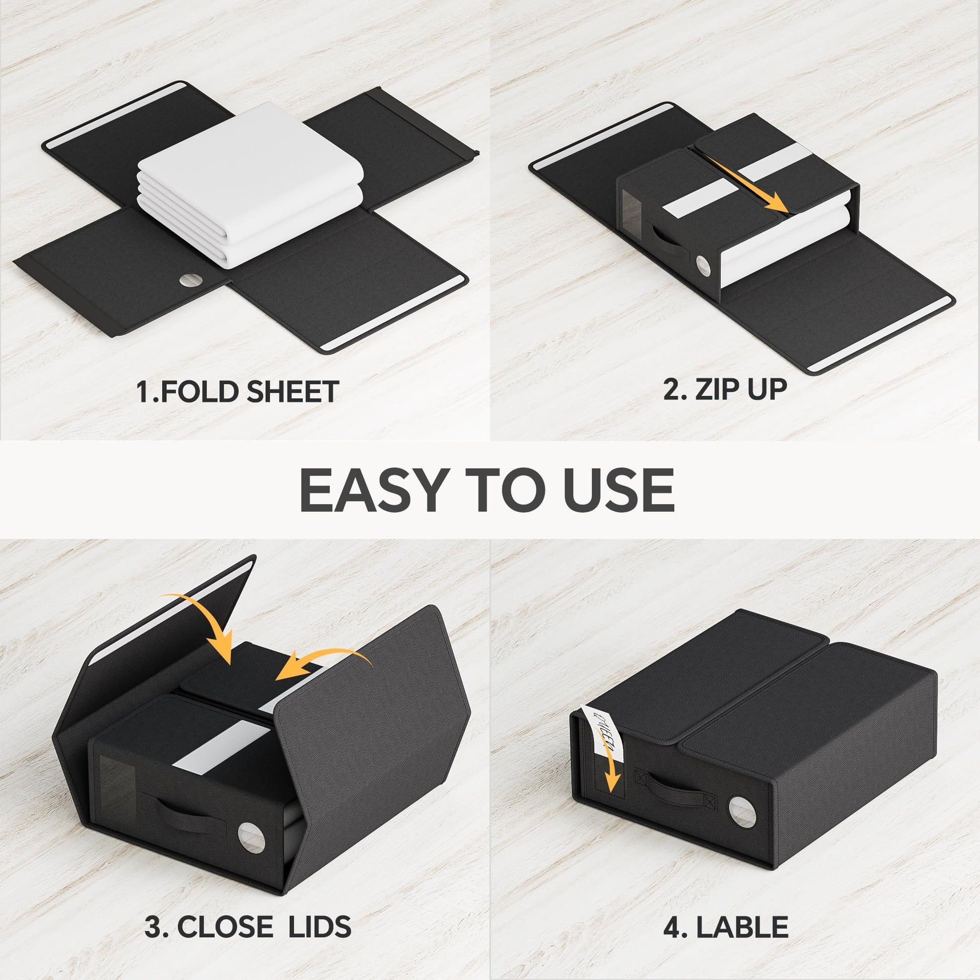 The 4-Pack bed sheet storage will compress sheets in just 3 easy steps: Place → Fold → Zip.