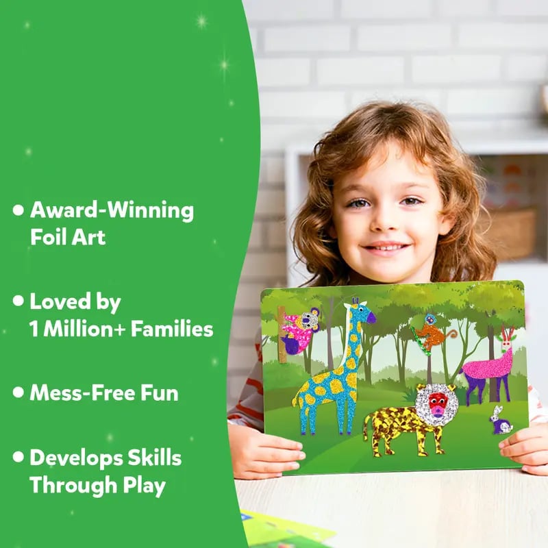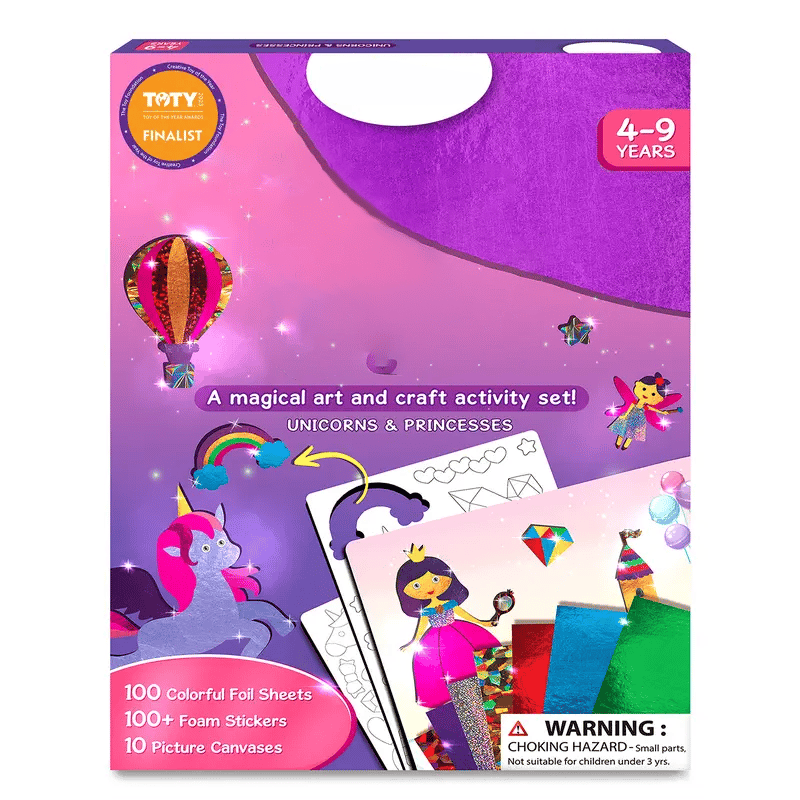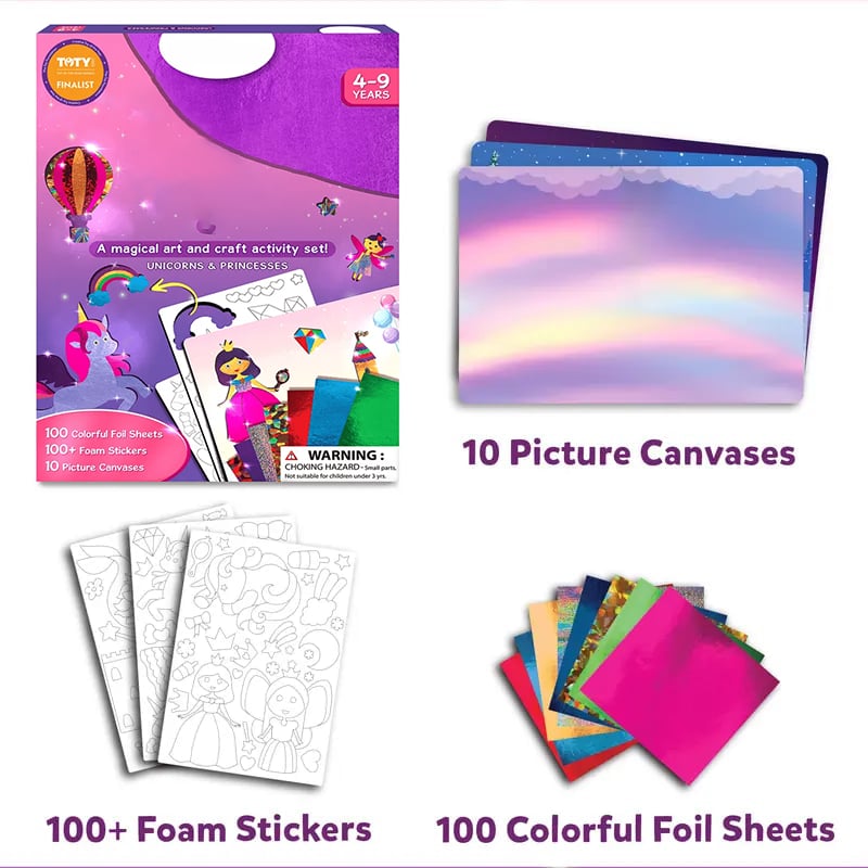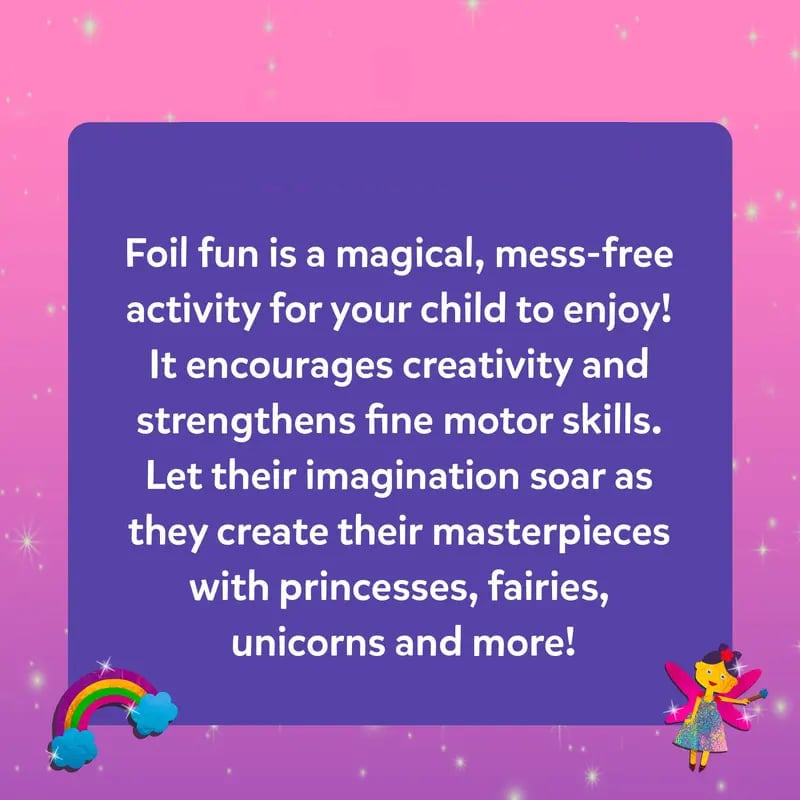 •Foil art & craft activity: Let your child's imagination soar with this magical, mess-free foil art and craft activity. They can create stunning pictures featuring princesses, fairies, and unicorns, sparking hours of creative play!