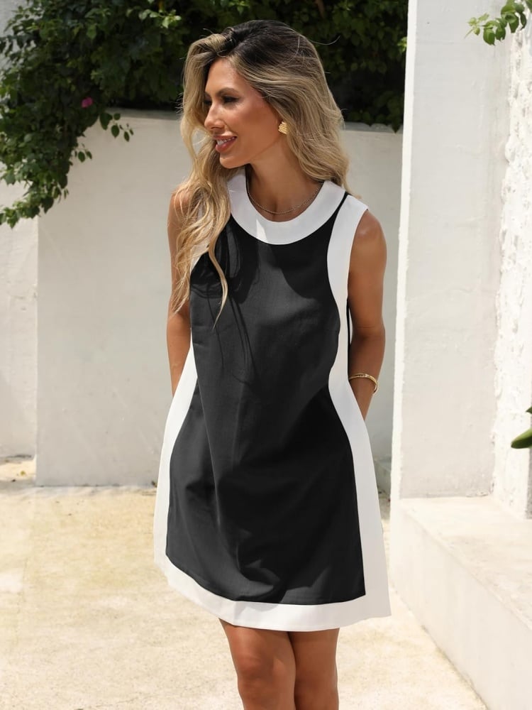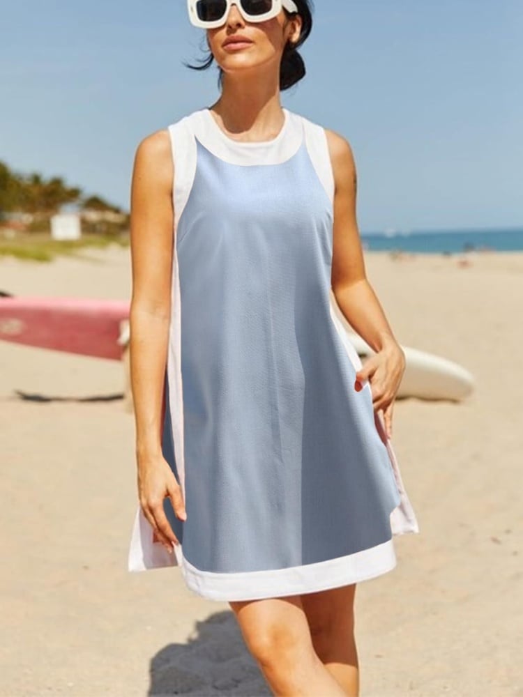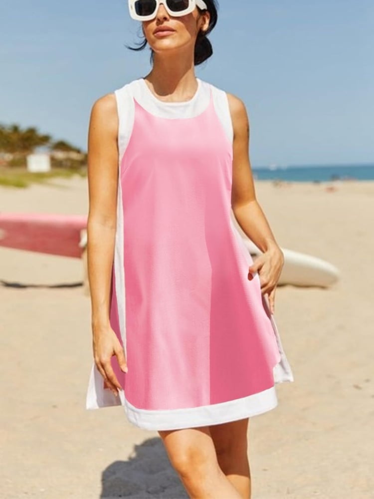 Feature: Two piece oufits, casual sets, crewneck, color block, side slit of top, sleeveless pullover top, solid shorts with pockets, creating a relaxed and slouchy silhouette